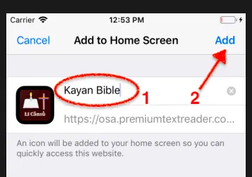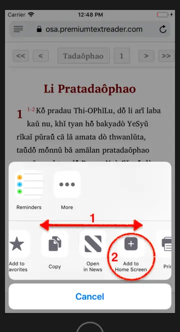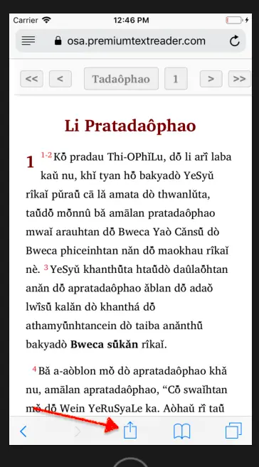ကယန်းသမ္မာကျမ်းစာကို အိုင်ဖုန်းဖြင့် ဖတ်၊ ကြည့်၊ နားထောင်လိုပါက မိမိ၏အိုင်ဖုန်း ဒါမှမဟုတ် တက်ပလက် ကိုဖွင့်ပြီး https://osa.premiumtextreader.com/kayan/index.html ထဲကို၀င်ပါ